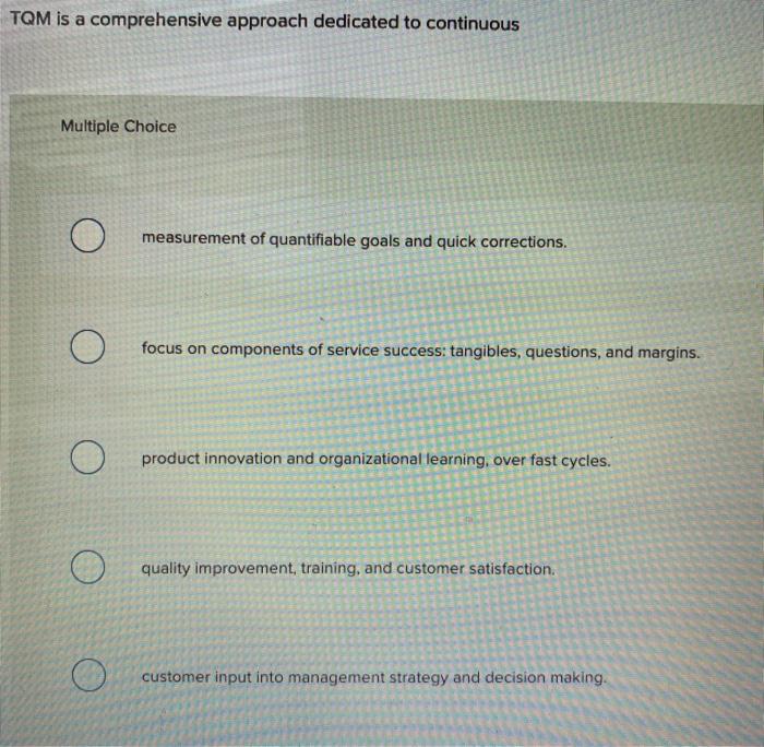 Tangibles questions and margins. TQM is a comprehensive approach dedicated to continuous Multiple Choice measurement of quantifiable goals and quick corrections. Quality improvement training and customer satisfaction.